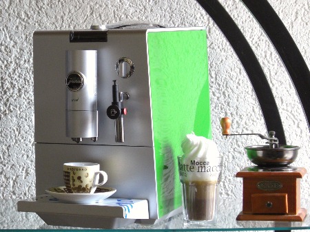 Die Ena 5 ist ähnlich wie die Ena 3, nur mit Easy-Cappuccinatore. Und in sieben Farben erhältlich. rot, grün, braun, creme, hellblau, weiß, schwarz